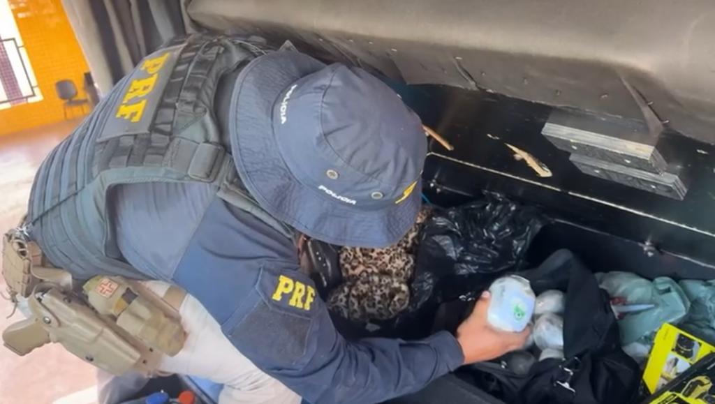 Já nesta quinta-feira (4), o nervosismo novamente chamou a atenção dos agentes da PRF, desta vez durante a fiscalização de um Jeep Renegade. O motorista apresentou comportamento suspeito, levando os policiais a aprofundarem a vistoria. Ao acessarem a área do estepe, encontraram um fundo falso no para-choque traseiro, onde estavam armazenados 20 tabletes de cloridrato de cocaína, somando 20,8 kg.
