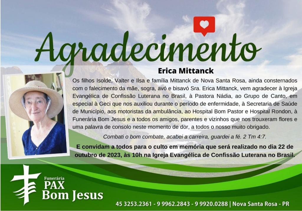 Os filhos Isolde, Valter e Ilsa e família Mittanck de Nova Santa Rosa, ainda consternados com o falecimento da mãe, sogra, avó e bisavó Sra. Erica Mittanck, vem agradecer à Igreja Evangélica de Confissão Luterana no Brasil, à Pastora Nádia, ao Grupo de Canto, em especial à Geci que nos auxiliou durante o período de enfermidade, à Secretaria de Saúde de Município, aos motoristas da ambulância, ao Hospital Bom Pastor e Hospital Rondon, à Funerária Bom Jesus e a todos os amigos, parentes e vizinhos que nos trouxeram flores e uma palavra de consolo neste momento de dor, a todos o nosso muito obrigado.