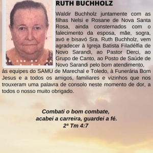 Waldir Buchholz juntamente com as filhas Nelsi e Rosane de Nova Santa Rosa, ainda consternados com o falecimento da esposa, mãe, sogra, avó e bisavó Sra. Ruth Buchholz, vem agradecer à Igreja Batista Filadélfia de Novo Sarandi, ao Pastor Derci, ao Grupo de Canto, ao Posto de Saúde de Novo Sarandi pelo bom atendimento, às equipes do SAMU de Marechal e Toledo, à Funerária Bom Jesus e a todos os amigos, familiares e vizinhos que nos trouxeram uma palavra de consolo neste momento de dor, a todos o nosso muito obrigado.