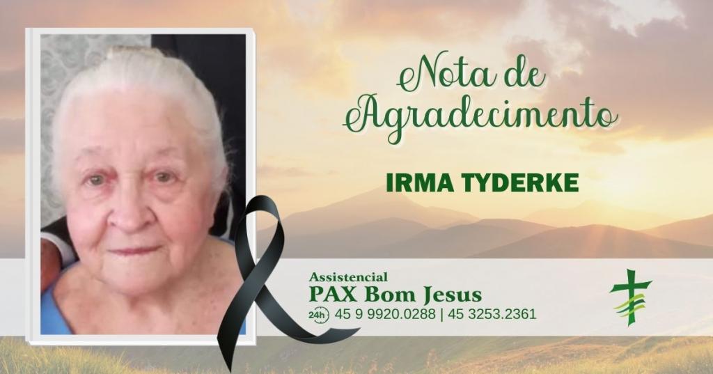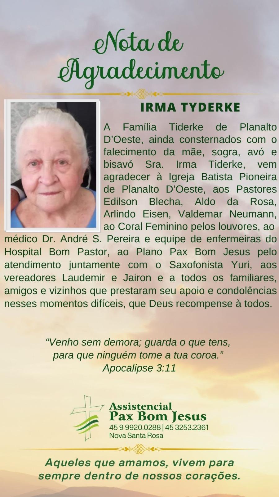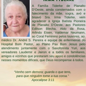 A Família Tiderke de Planalto D’Oeste, ainda consternados com o falecimento da mãe, sogra, avó e bisavó Sra. Irma Tiderke, vem agradecer à Igreja Batista Pioneira de Planalto D’Oeste, aos Pastores Edilson Blecha, Aldo da Rosa, Arlindo Eisen, Valdemar Neumann, ao Coral Feminino pelos louvores, ao médico Dr. André S. Pereira e equipe de enfermeiras do Hospital Bom Pastor, ao Plano Pax Bom Jesus pelo atendimento juntamente com o Saxofonista Yuri, aos vereadores Laudemir e Jairon e a todos os familiares, amigos e vizinhos que prestaram seu apoio e condolências nesses momentos difíceis, que Deus recompense à todos.