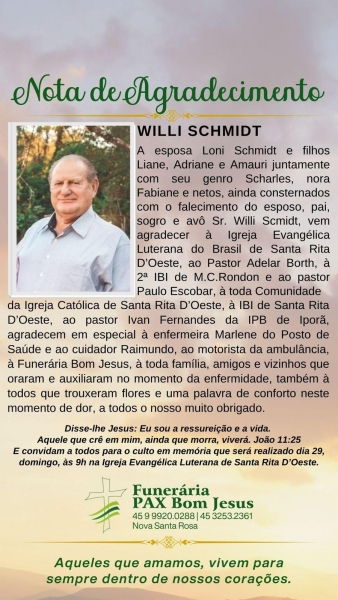 A esposa Loni Schmidt e filhos Liane, Adriane e Amauri juntamente com seu genro Scharles, nora Fabiane e netos, ainda consternados com o falecimento do esposo, pai, sogro e avô Sr. Willi Scmidt, vem agradecer à Igreja Evangélica Luterana do Brasil de Santa Rita D’Oeste, ao Pastor Adelar Borth, à 2ª IBI de M.C.Rondon e ao pastor Paulo Escobar, à toda Comunidade da Igreja Católica de Santa Rita D’Oeste, à IBI de Santa Rita D’Oeste, ao pastor Ivan Fernandes da IPB de Iporã, agradecem em especial à enfermeira Marlene do Posto de Saúde e ao cuidador Raimundo, ao motorista da ambulância, à Funerária Bom Jesus, à toda família, amigos e vizinhos que oraram e auxiliaram no momento da enfermidade, também à todos que trouxeram flores e uma palavra de conforto neste momento de dor, a todos o nosso muito obrigado.