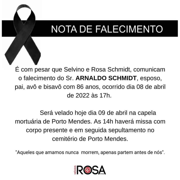 A direção e funcionários da Móveis Rosa de Marechal Cândido Rondon, Nova Santa Rosa e Maripá, com pesar comunicam o falecimento do esposo, pai, sogro, avô e bisavô, Sr. Arnaldo Schmidt, ocorrido ontem (08) as 17h00, aos 86 anos de idade.