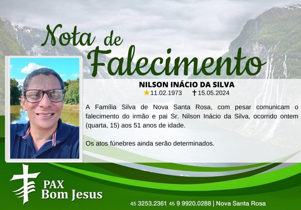 A Família Silva de Nova Santa Rosa, com pesar comunicam o falecimento do irmão e pai Sr. Nilson Inácio da Silva, ocorrido ontem (quarta, 15) aos 51 anos de idade.