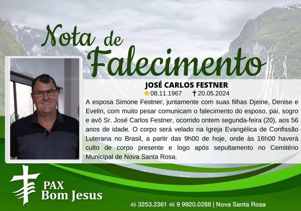 A esposa Simone Festner, juntamente com suas filhas Djeine, Denise e Evelin, com muito pesar comunicam o falecimento do esposo, pai, sogro e avô Sr. José Carlos Festner, ocorrido ontem segunda-feira (20), aos 56 anos de idade.