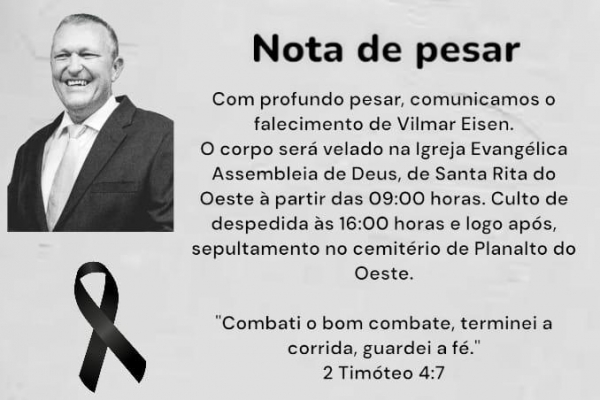 A Esposa Marlisete Lange Eisen e família de Nova Santa Rosa com pesar comunicam o falecimento do esposo,pai, sogro e avô, Sr. Vilmar Eisen - popular Chico, ocorrido hoje (04), aos 50 anos.