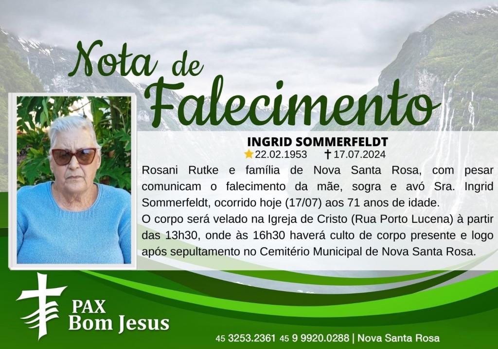Rosani Rutke e família de Nova Santa Rosa, com pesar comunicam o falecimento da mãe, sogra e avó Sra. Ingrid Sommerfeldt, ocorrido hoje (17/07) aos 71 anos de idade.