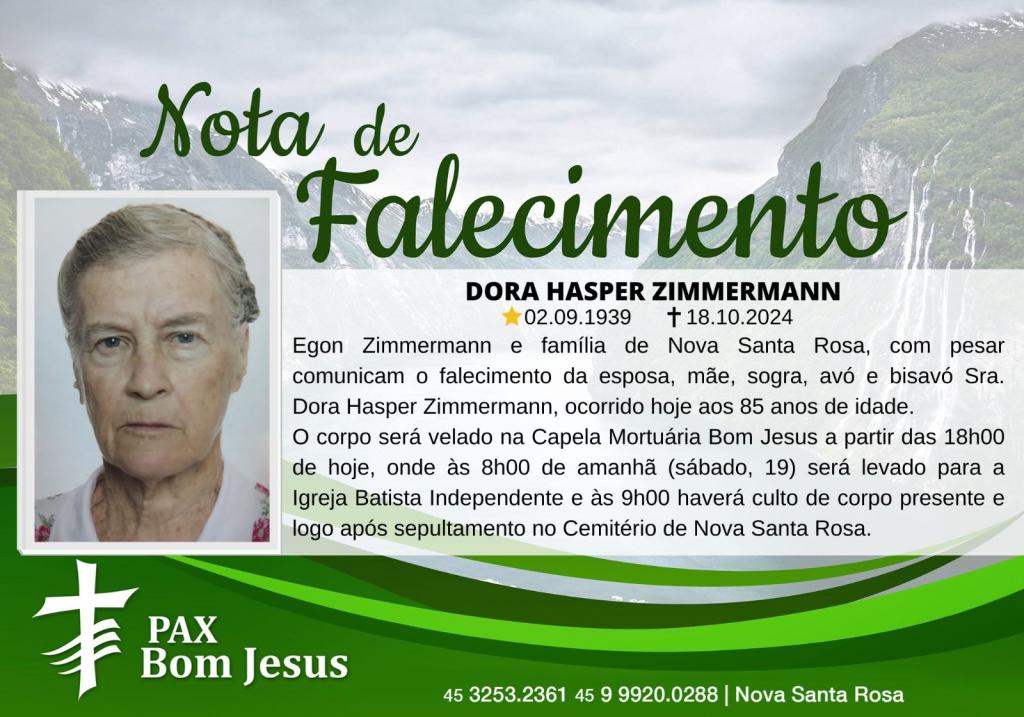 Egon Zimmermann e família de Nova Santa Rosa, com pesar comunicam o falecimento da esposa, mãe, sogra, avó e bisavó Sra. Dora Hasper Zimmermann, ocorrido hoje (18) aos 85 anos de idade.