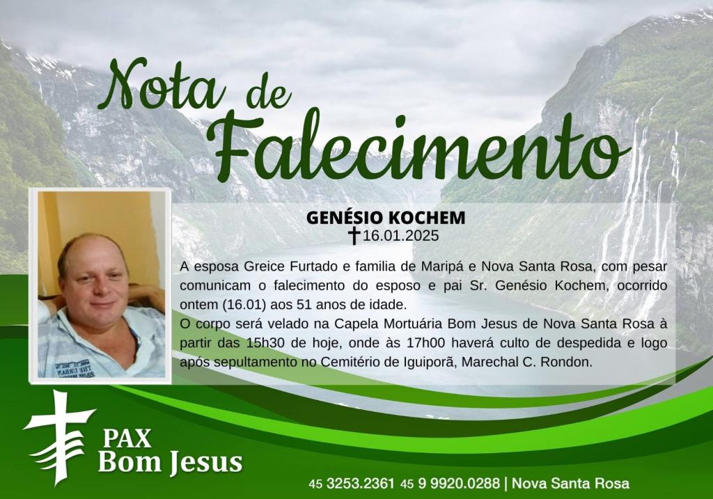 A esposa Greice Furtado e familia de Maripá e Nova Santa Rosa, com pesar comunicam o falecimento do esposo e pai Sr. Genésio Kochem, ocorrido ontem (16.01) aos 51 anos de idade.