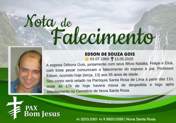 A esposa Débora Gois, juntamente com seus filhos Natália, Felipe e Eloá, com triste pesar comunicam o falecimento do esposo e pai, Professor Edson, ocorrido hoje (13) aos 55 anos de idade.