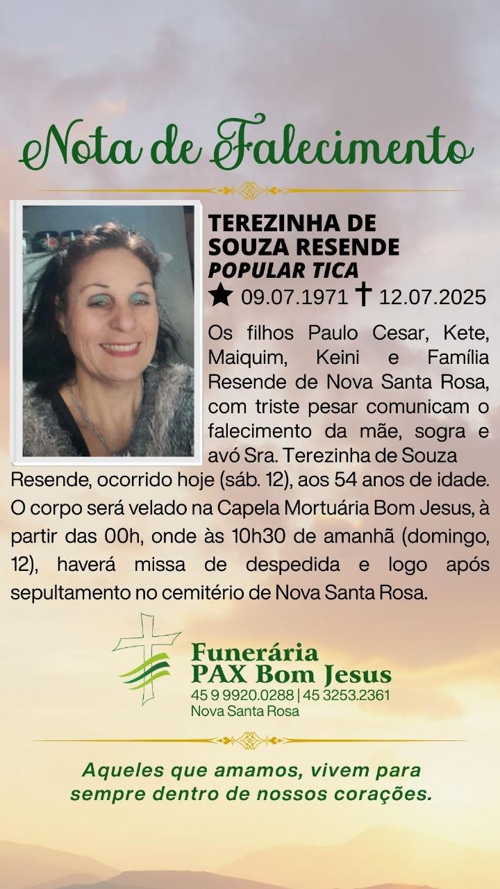 Os filhos Paulo Cesar, Kete, Maiquim, Keini e família Resende de Nova Santa Rosa, com triste pesar comunicam o falecimento da mãe, sogra e avó Sra. Terezinha de Souza Resende, ocorrido hoje (sáb. 12), aos 54 anos de idade.
