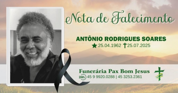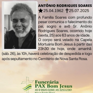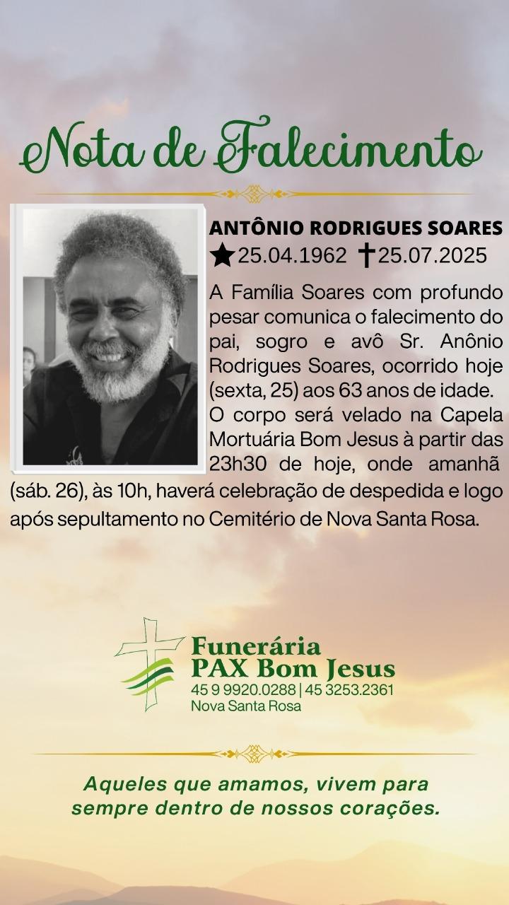 A Família Soares com profundo pesar comunica o falecimento do pai, sogro e avô Sr. Anônio Rodrigues Soares, ocorrido hoje (sexta, 25) aos 63 anos de idade.