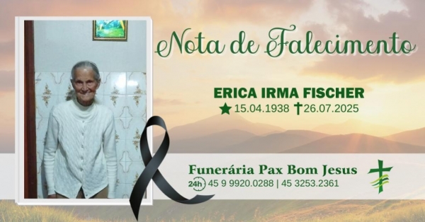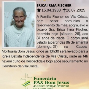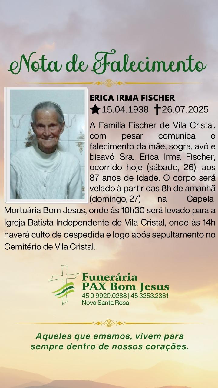 A Família Fischer de Vila Cristal, com pesar comunica o falecimento da mãe, sogra, avó e bisavó Sra. Erica Irma Fischer, ocorrido hoje, sábado (26), aos 87 anos de idade.