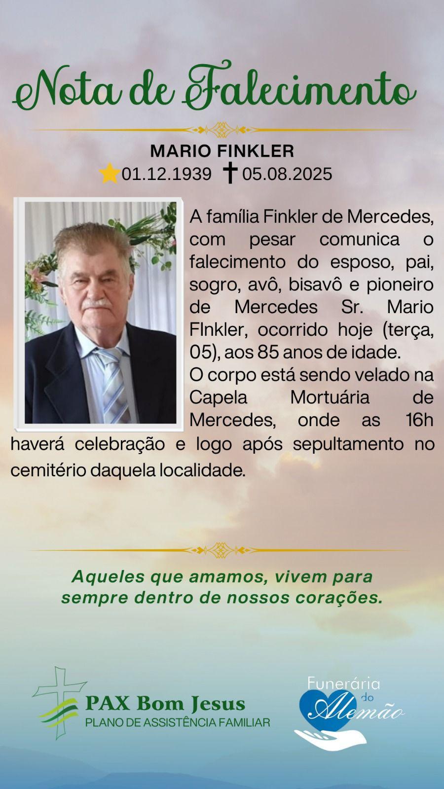 A família Finkler de Mercedes, com pesar comunica o falecimento do esposo, pai, sogro, avô, bisavô e pioneiro de Mercedes Sr. Mario FInkler, ocorrido hoje (05), aos 85 anos de idade.