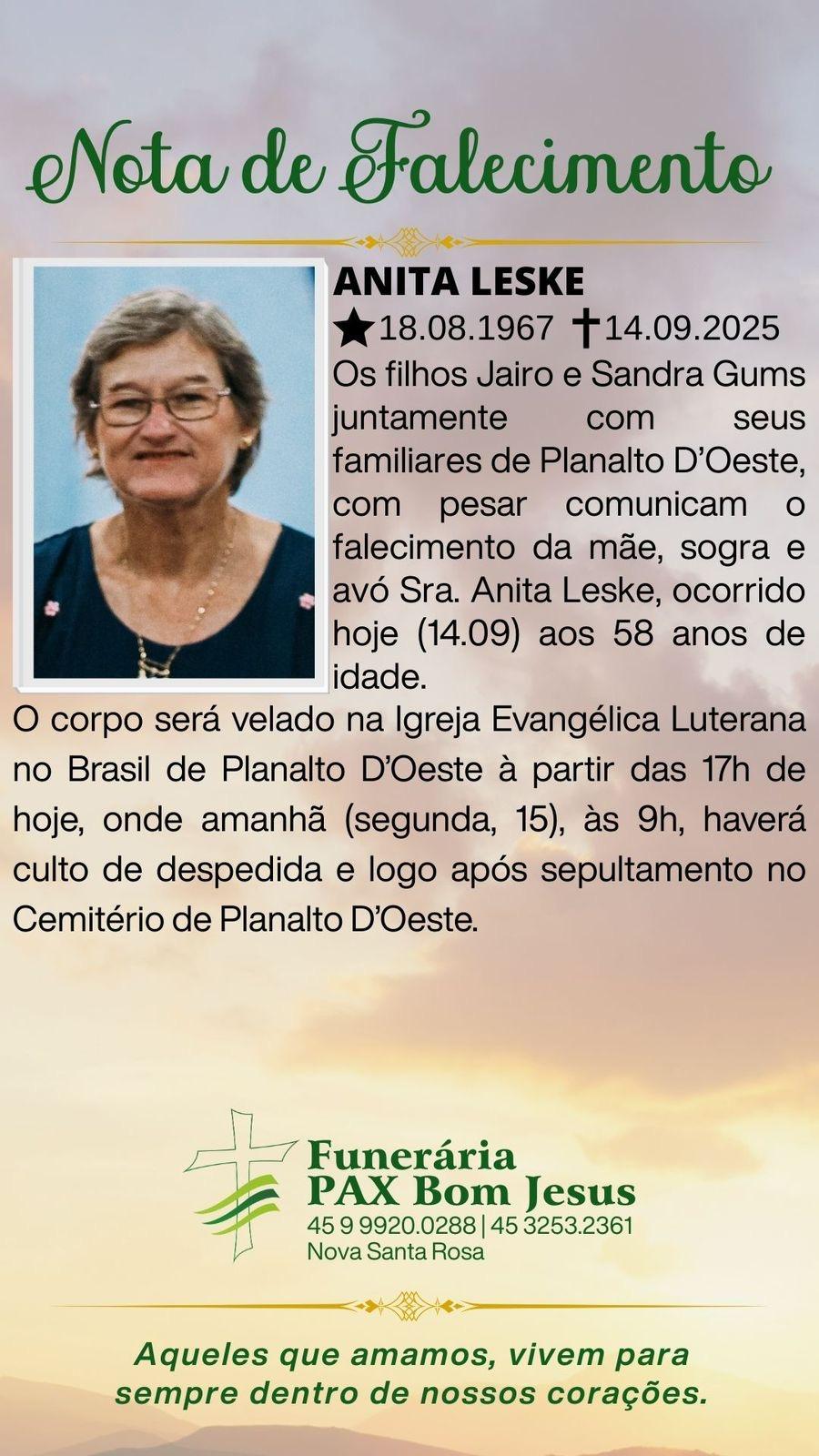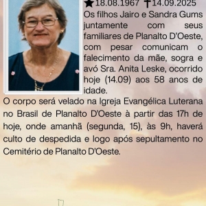 Os filhos Jairo e Sandra Gums juntamente com seus familiares de Planalto D’Oeste, com pesar comunicam o falecimeto da mãe, sogra e avó Sra. Anita Leske, ocorrido hoje (14.09) aos 58 anos de idade.