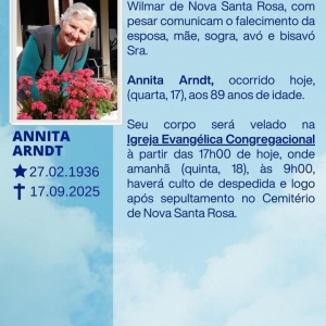 O esposo Oscar Eduardo Arndt e os filhos Darli, Milton, Wilson e Wilmar de Nova Santa Rosa, com pesar comunicam o falecimento da esposa, mãe, sogra, avó e bisavó Sra. Annita Arndt, ocorrido hoje (quarta, 17), aos 89 anos de idade.