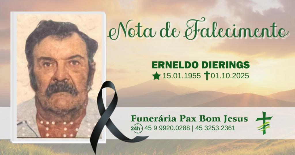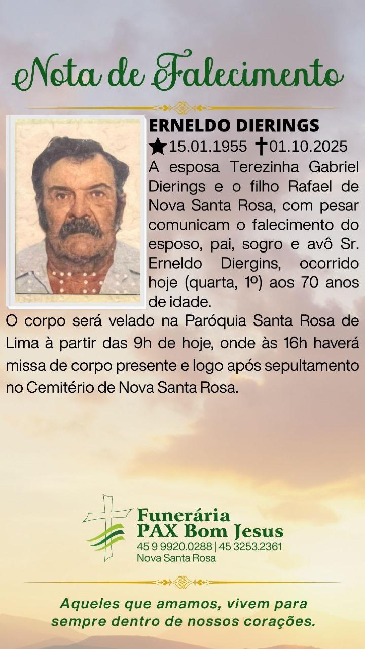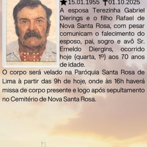 A esposa Terezinha Gabriel Dierings e o filho Rafael de Nova Santa Rosa, com pesar comunicam o falecimento do esposo, pai, sogro e avô Sr. Erneldo Diergins, ocorrido hoje (01) aos 70 anos de idade.