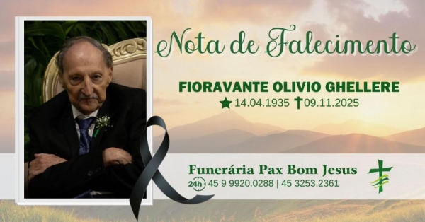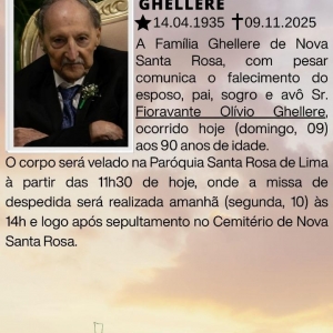 A Família Ghellere de Nova Santa Rosa, com pesar comunica o falecimento do esposo, pai, sogro e avô Sr. Fioravante Olívio Ghellere, ocorrido hoje (09) aos 90 anos de idade.