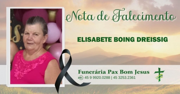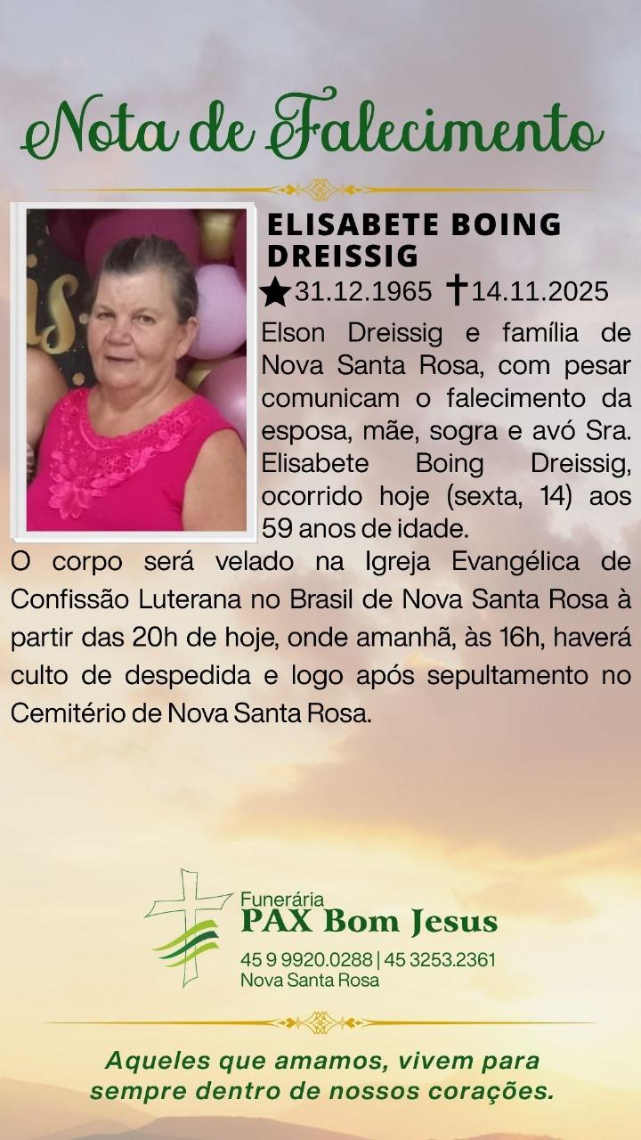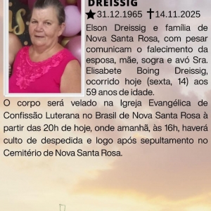 Elson Dreissig e família de Nova Santa Rosa, com pesar comunica o falecimento da esposa, mãe, sogra e avó Sra. Elisabete Boing Dreissig, ocorrido hoje (sexta, 14) aos 59 anos de idade.