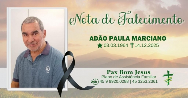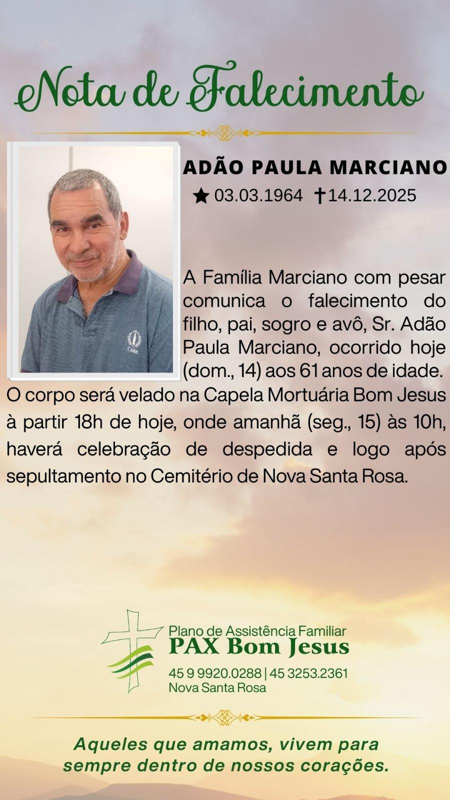 A Família Marciano com pesar comunica o falecimento do filho, pai, sogro e avô, Sr. Adão Paula Marciano, ocorrido hoje (14) aos 61 anos de idade.