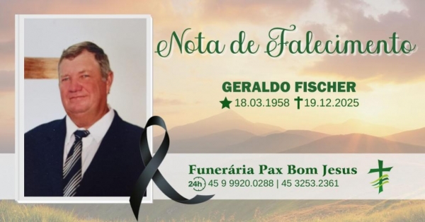A esposa Maidi Fischer e família, com pesar comunicam o falecimento do esposo, pai, sogro e avô Sr. Geraldo Fischer, ocorrido ontem (19), aos 67 anos de idade.