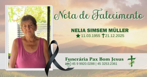 A Família Müller de Nova Santa Rosa, com pesar comunica o falecimento da mãe, soga, avó e bisavó Sra. Nelia Simsem Müller, ocorrido hoje (21) aos 70 anos de idade.