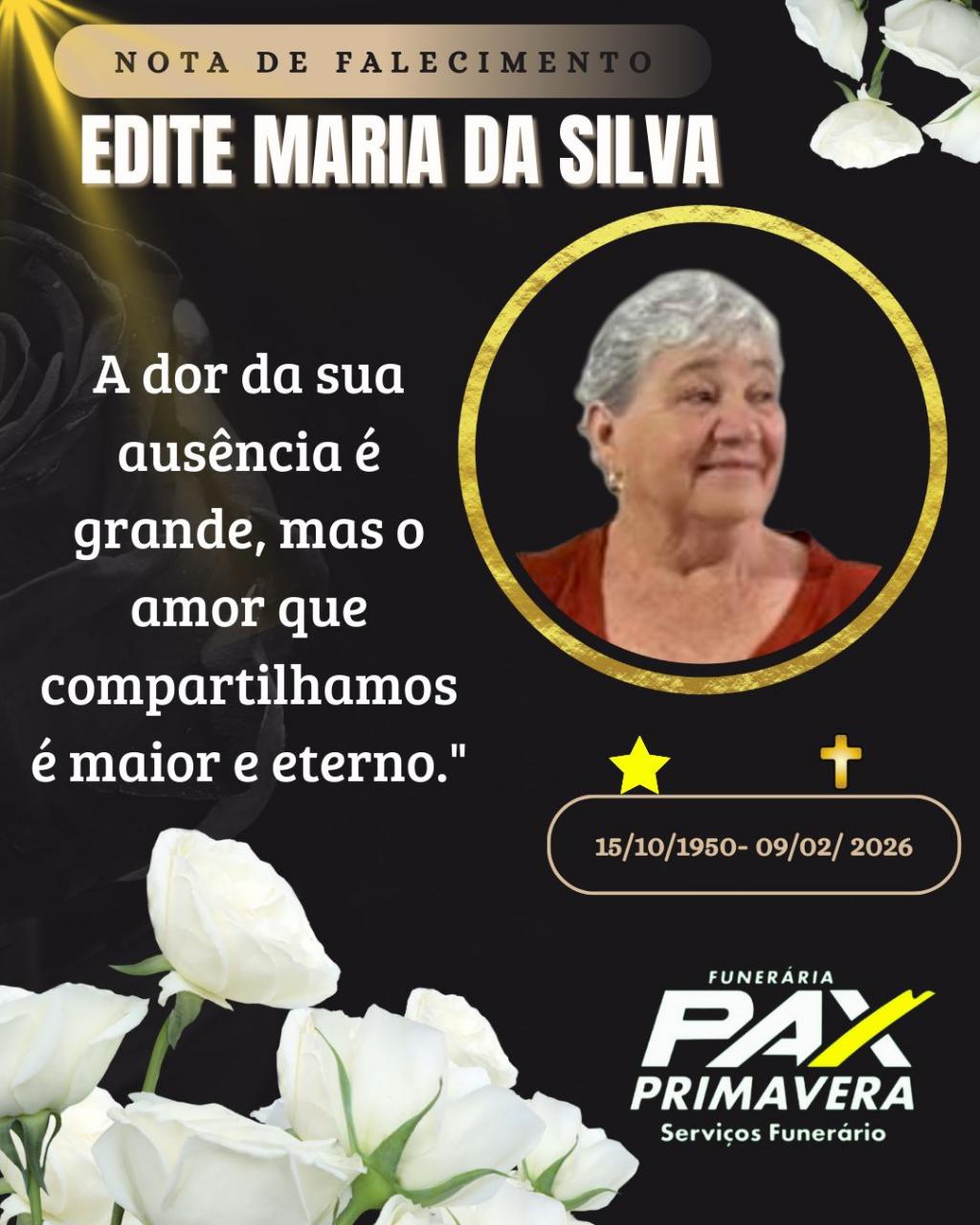 A Funerária PAX Primavera e a família Silva com pesar comunicam o falecimento de Edite Maria da Silva, aos 75 anos de idade.