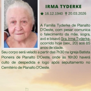 A Família Tyderke de Planalto D’Oeste, com pesar comunica o falecimento da mãe, sogra, avó e bisavó Sra. Irma Tyderke, ocorrido hoje (20) aos 85 anos de idade.