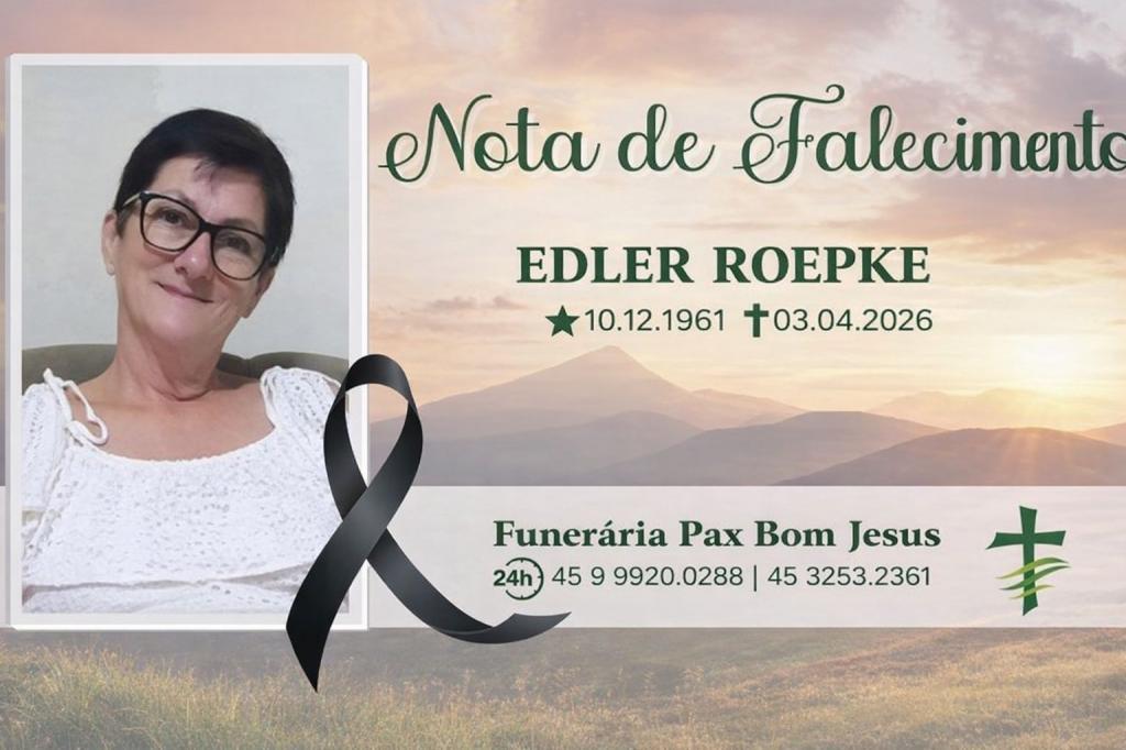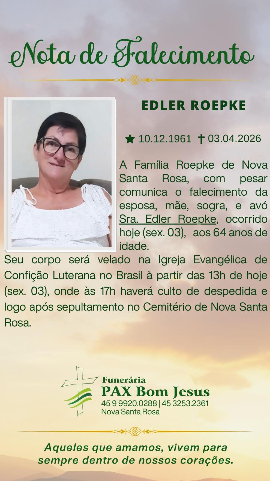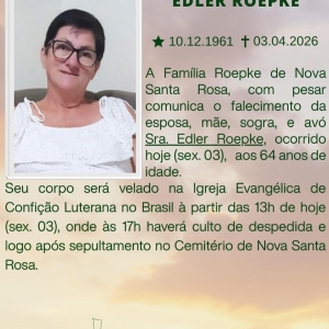 A Família Roepke de Nova Santa Rosa, com pesar comunica o falecimento da esposa, mãe, sogra, e avó Sra. Edler Roepke, ocorrido hoje (03), aos 64 anos de idade.