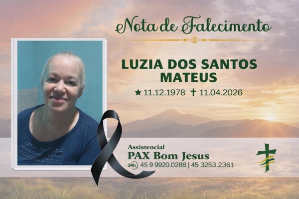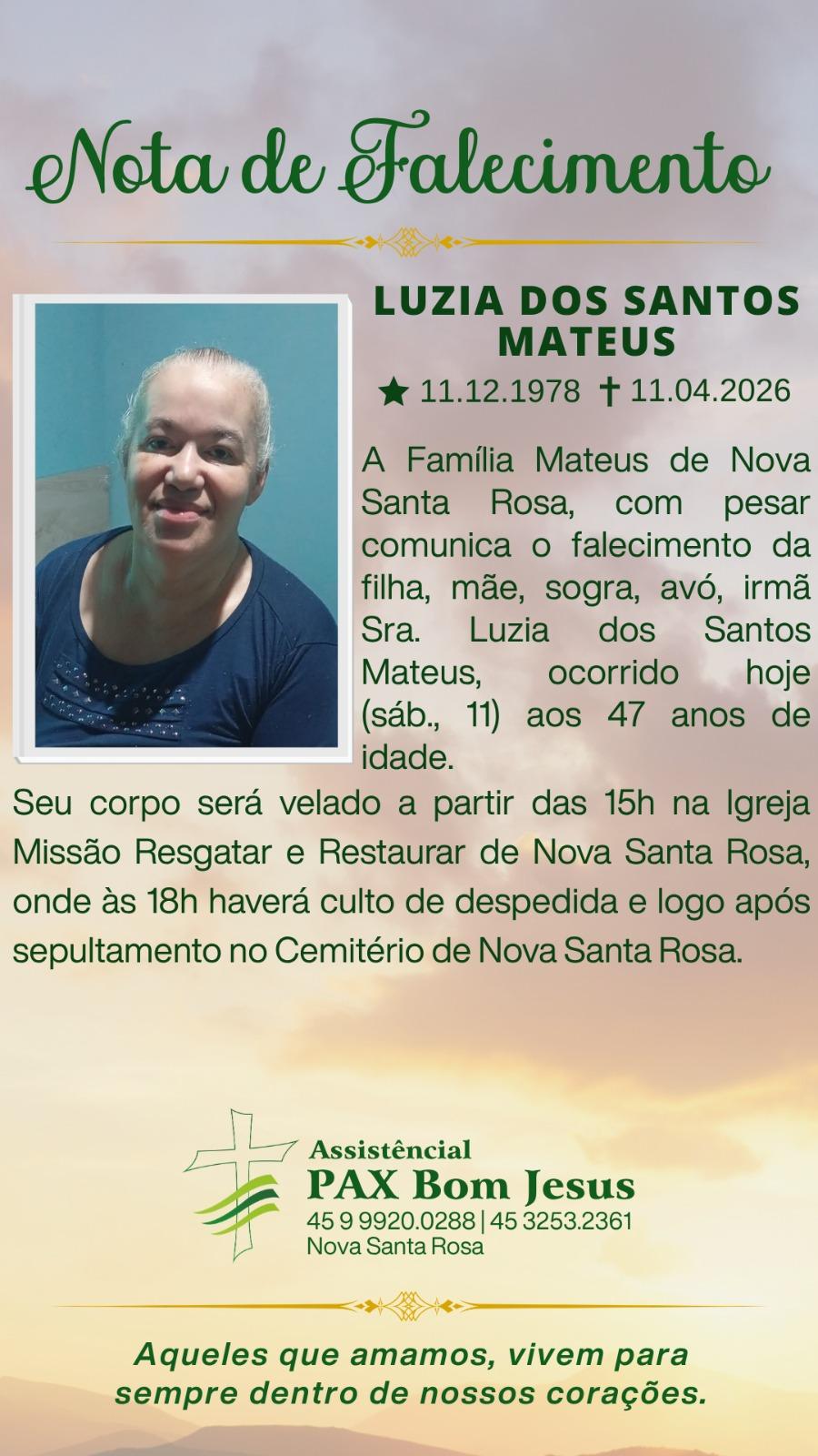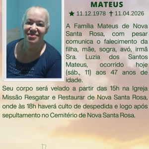 A Família Mateus de Nova Santa Rosa, com pesar comunica o falecimento da filha, mãe, sogra, avó, irmã Sra. Luzia dos Santos Mateus, ocorrido hoje (11) aos 47 anos de idade.