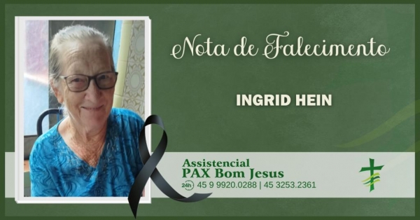 O esposo Osvino Hein juntamente com seus filhos Kelli e Gilberto Hein, com pesar comunicam o falecimento da esposa, mãe, sogra e avó Sra. Ingrid Hein, ocorrido ontem (24) aos 71 anos de idade.