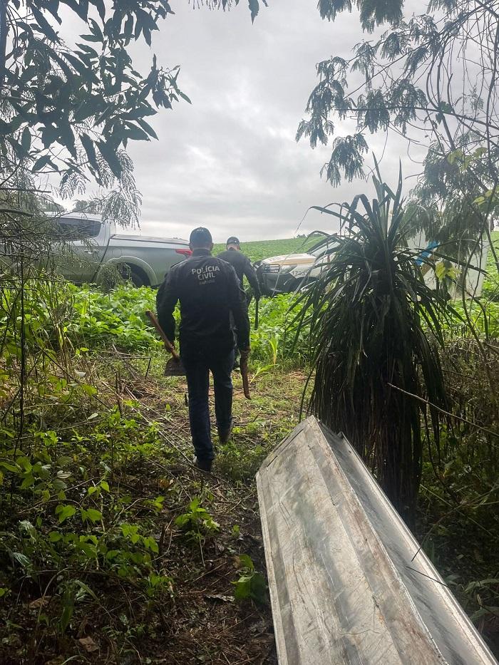 Durante as buscas, os agentes identificaram uma cova contendo fragmentos de ossos humanos, entre eles um fêmur e vértebras cervicais.