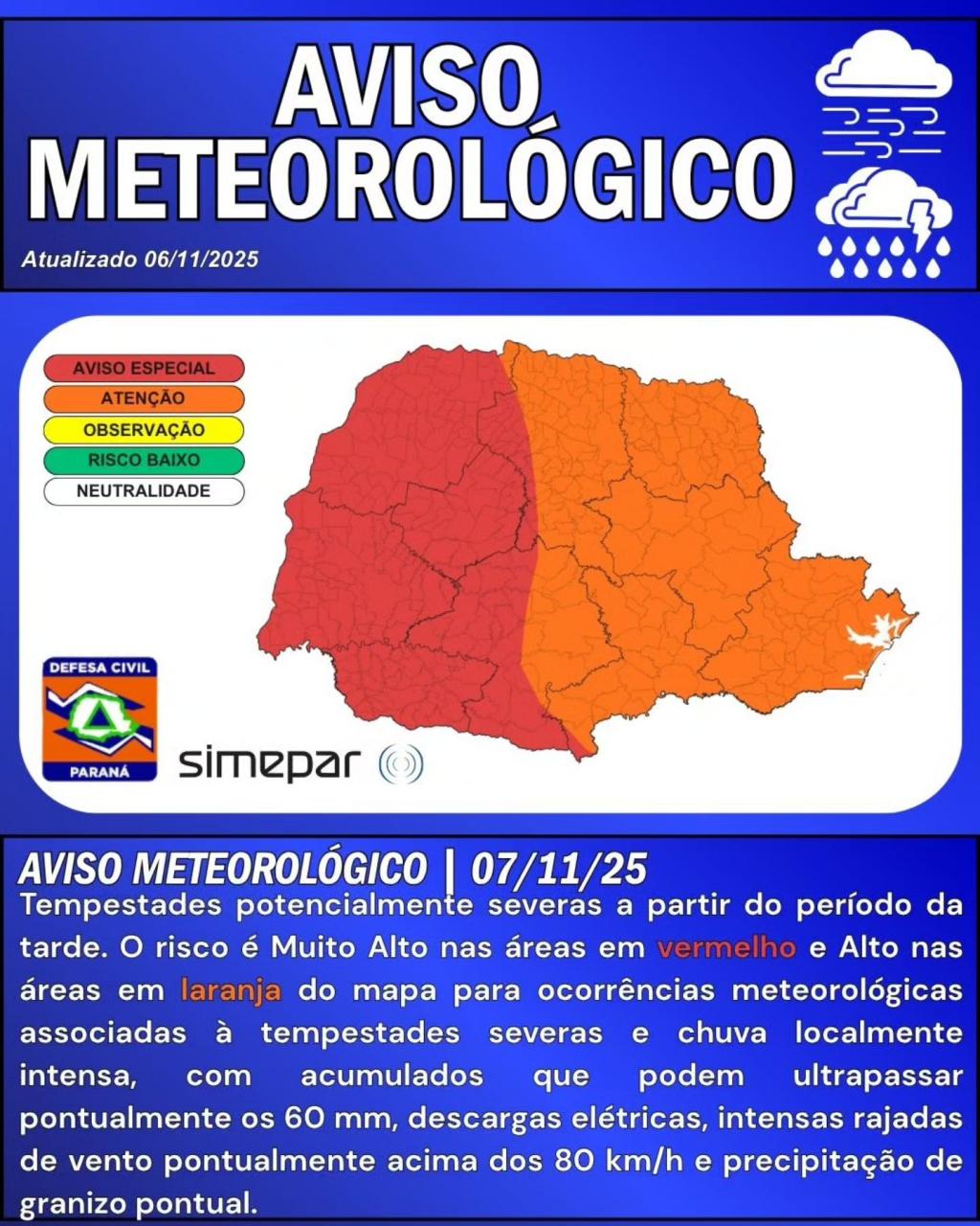 A Defesa Civil do Paraná e o Simepar emitiram um Aviso Meteorológico Especial para esta sexta-feira (07), colocando Nova Santa Rosa na região classificada com Risco Muito Alto (cor vermelha) para a ocorrência de tempestades severas.