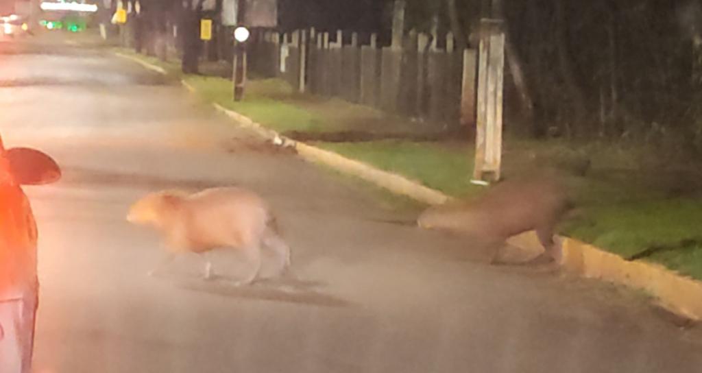 Edson Vorpagel, morador de Nova Santa Rosa flagrou as inúmeras capivaras moradoras do Lago Municipal de Marechal Rondon em uma de suas travessias diárias que acontecem e param o trânsito.
