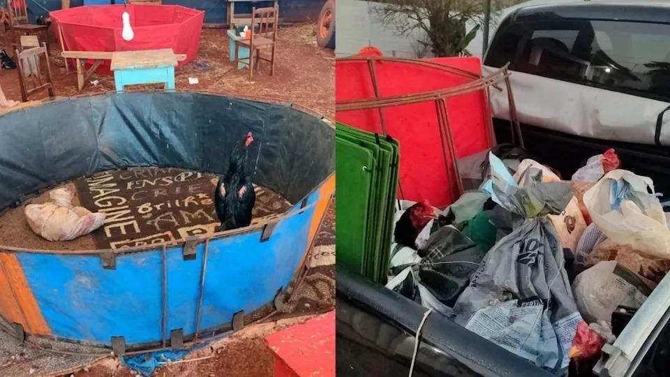 No local, foram encontrados 32 galos, duas arenas, sete gaiolas, medicamentos, ferramentas, uma espingarda calibre 12 com a numeração suprimida e um revólver Taurus calibre .38 com cinco munições intactas. Durante a operação, também foram apreendidos 132 ponteiras de espora, 61 biqueiras de aço, uma garrucha calibre .38 com três munições e diversos celulares.