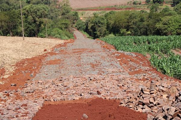 PAVIMENTAÇÃO POLIÉDRICA 1 – Outra obra em andamento é a pavimentação poliédrica com pedra irregular em trecho de 1,2 quilômetro de extensão na MR 412, localizada na Linha 05 de Outubro. O investimento é de R$ 304.120,80, custeados com recursos próprios.