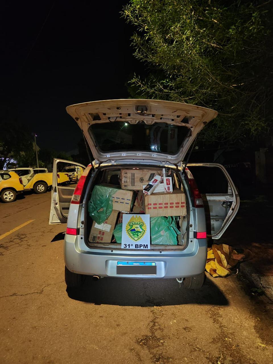 Os policiais encontraram o veículo na área rural do município. Dentro dele, haviam 15 caixas de cigarros contrabandeados.