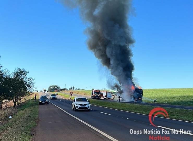 Ônibus de viagem pegou fogo na BR 277, entre Medianeira e São Miguel do Iguaçu, na tarde desta terça-feira (13).