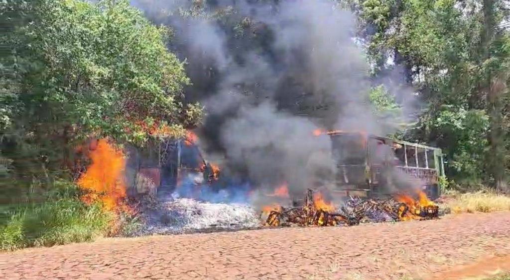 Dois ônibus sucateados foram destruídos após um incêndio, na Vila Verdes Campo, zona rural de Dois Vizinhos.