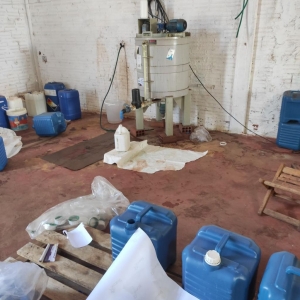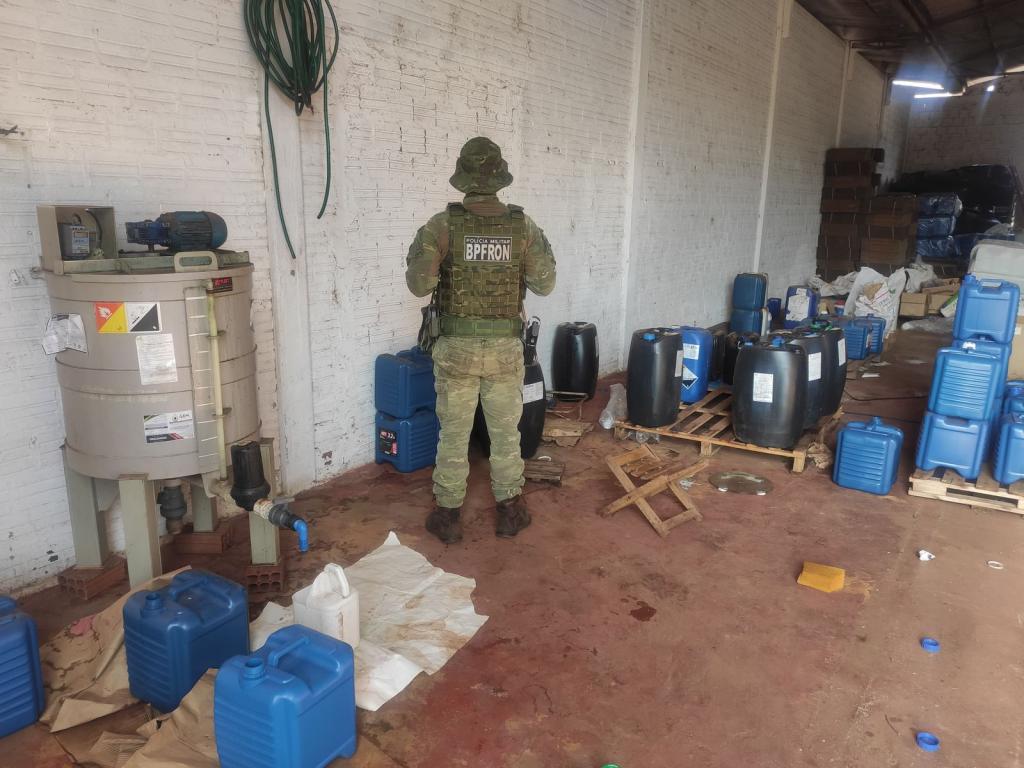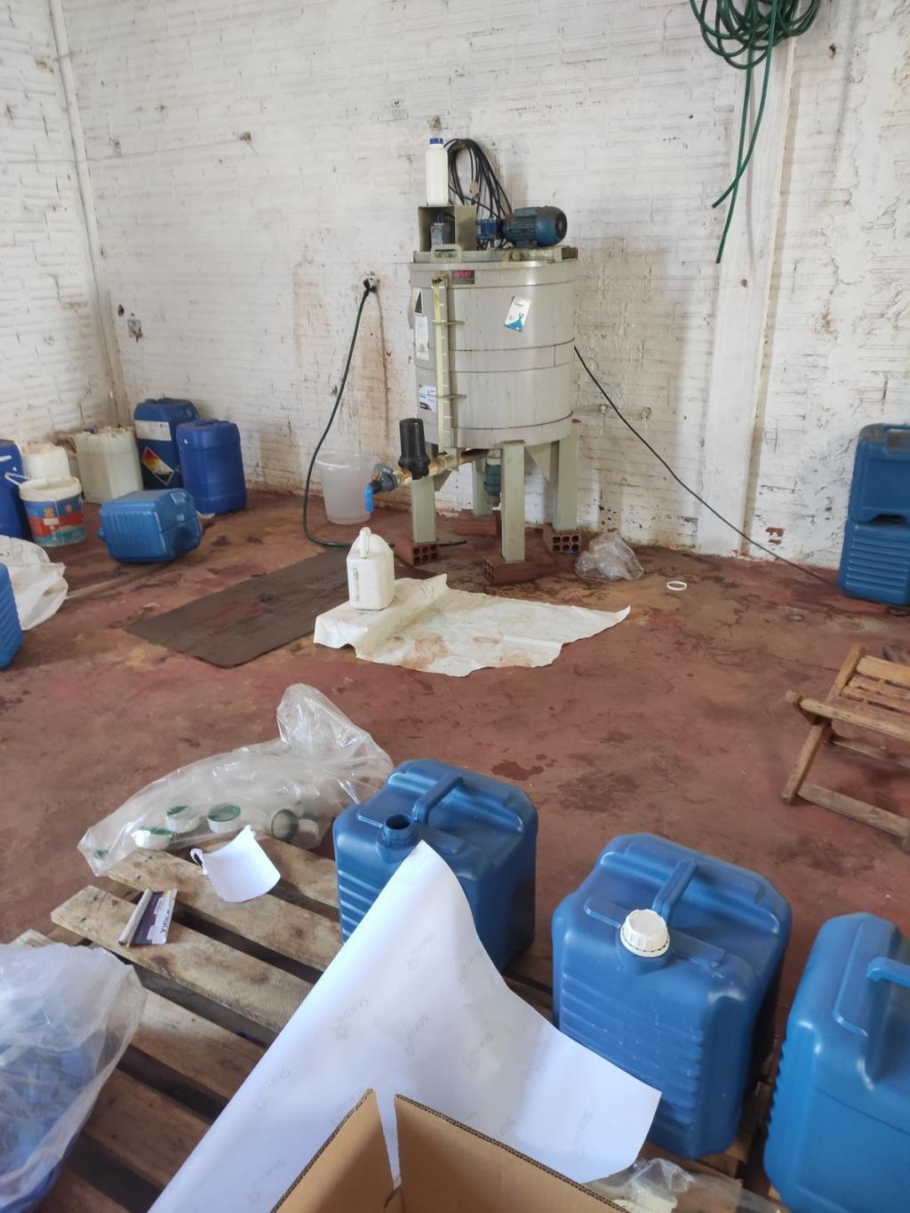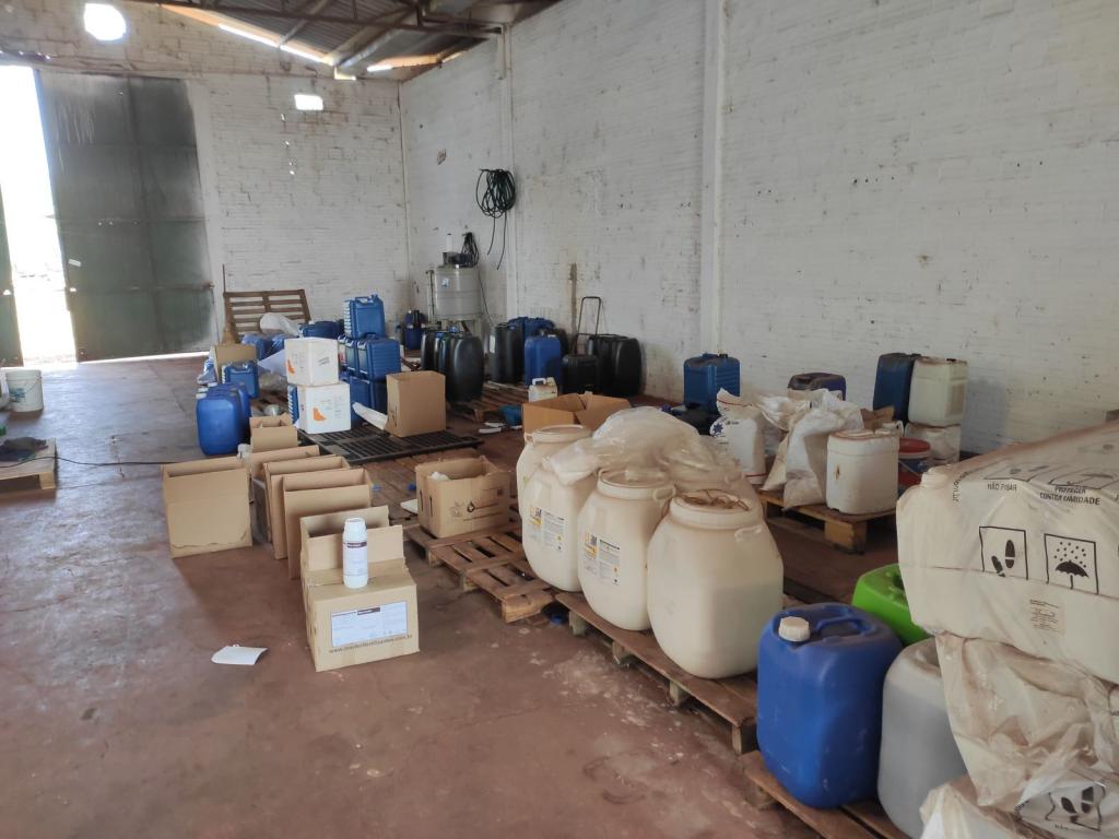 A ação fiscal revelou a presença de uma fábrica clandestina de envase, manipulação e fabricação de insumos agrícolas, agrotóxicos, fertilizantes e adjuvantes em outro barracão. Foram encontrados agrotóxicos vencidos, embalagens sem identificação do fabricante, além de equipamentos para mistura de produtos sólidos e líquidos.