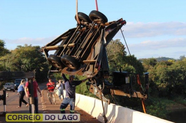Uma operação foi realizada na tarde desta terça-feira (01), para retirar uma carreta reboque que caiu da ponte do Rio São Francisco Falso, em Santa Helena.