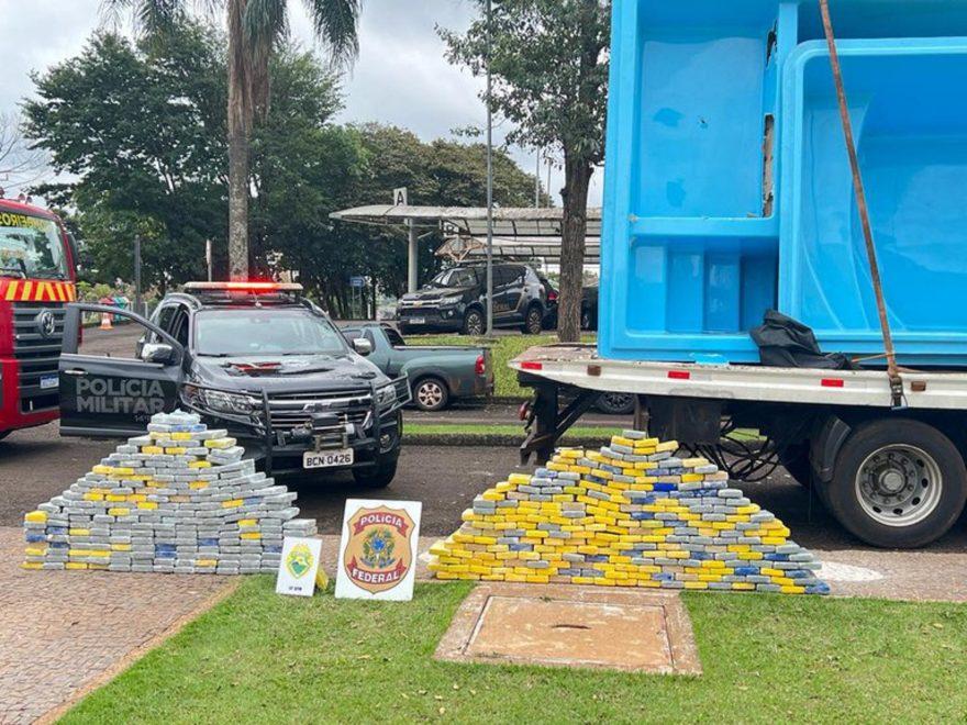 Em uma ação integrada entre a Polícia Federal e a Polícia Militar/PR, foram apreendidos mais de 470kg de cocaína dissimulados na estrutura de piscinas de fibra que estavam prontas para serem levadas para o estado de Santa Catarina.