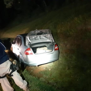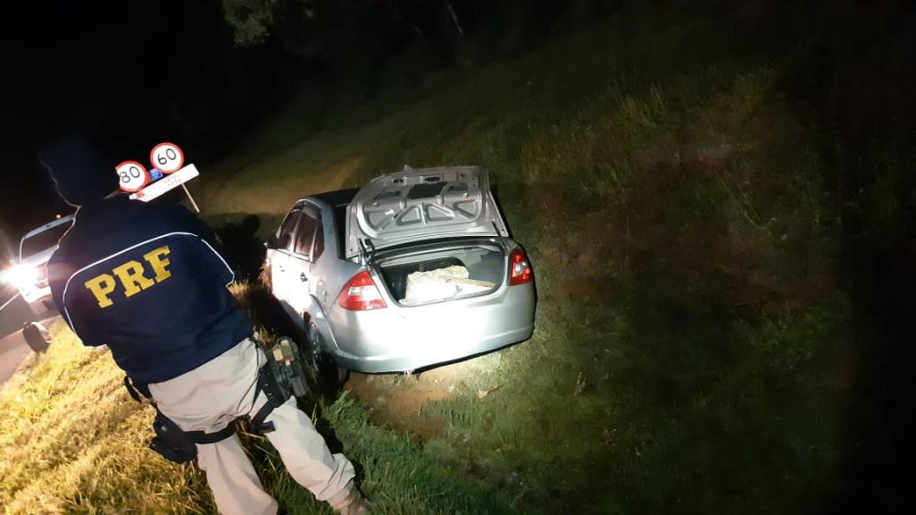 E, na madrugada desta sexta (29), por volta da meia-noite e meia, agentes abordaram um motorista de um Ford Fiesta em Irati (PR), na BR-277. O condutor fugiu e foi perseguido. Durante a fuga, ele jogou o carro para fora da rodovia e fugiu em meio a uma mata. No interior do Fiesta foram encontrados 202 quilos de maconha, que foram apreendidas e encaminhadas para a Polícia Civil em Irati para registro.