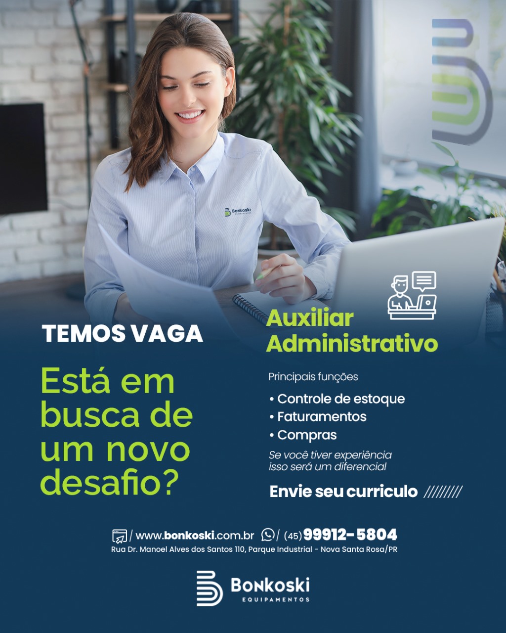A Bonkoski Equipamentos está com vaga para Auxiliar Administrativo, com as principais funções de faturamento, controle de estoque e compras.