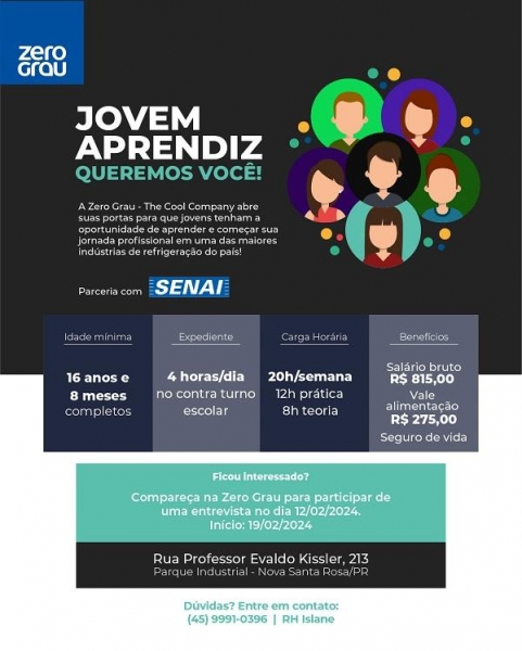 As entrevistas para seleção dos candidatos acontecerão no dia 12 de fevereiro, na sede da indústria Zero Grau, localizada na Rua Professor Evaldo Kissler, 213, Parque Industrial em Nova Santa Rosa/PR. O início das atividades para os novos participantes está marcado para o dia 19 de fevereiro.