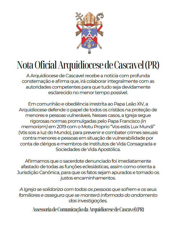 A Arquidiocese de Cascavel divulgou nota oficial na qual expressa consternação diante da denúncia e afirma que está colaborando integralmente com as autoridades competentes.