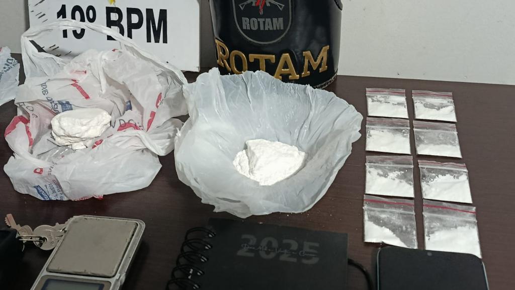 Ele ainda revelou que havia mais entorpecentes em sua residência, localizada em Toledo. Com autorização de um familiar que reside no local, os policiais entraram na casa e encontraram uma balança de precisão, oito porções de cocaína embaladas em zip lock (totalizando 8 gramas) e uma porção maior em pedra bruta (41 gramas).