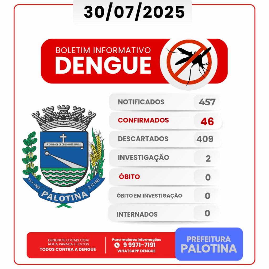 A Prefeitura de Palotina, por meio da Secretaria Municipal de Saúde, divulgou nesta quarta-feira (30) o novo boletim epidemiológico com dados atualizados sobre os casos de Dengue e Chikungunya no município.