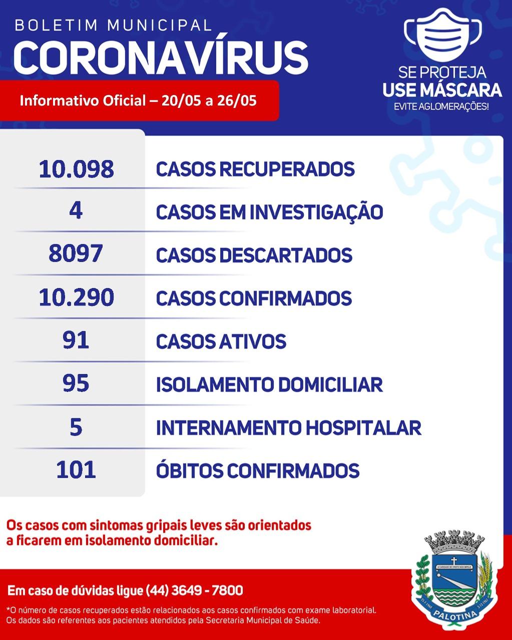 A Secretaria de Saúde de Palotina divulgou na manhã desta quinta-feira (26) o boletim informativo divulgado semanalmente (20/05 a 26/05) e aponta que, no período foram confirmados 91 casos novos de Covid-19 no Município, 66 pacientes se recuperaram, 05 palotinenses estão internados e o número de casos ativos no dia 26/05 somam 91.