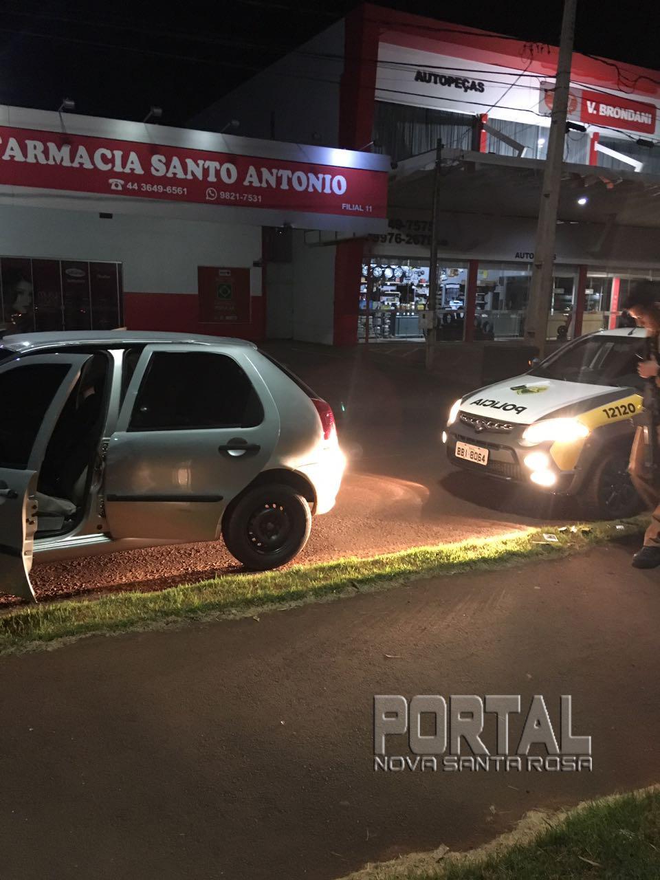 Em deslocamento a delegacia a equipe cruzou com o segundo veículo , o Palio de cor prata com placas AQX-2403 de Cascavel, foi dada voz de abordagem ao mesmo, onde durante verificação foi constato que o veiculo estava com pendências de licenciamento e foi recolhido ao pátio da Policia Militar de Palotina.