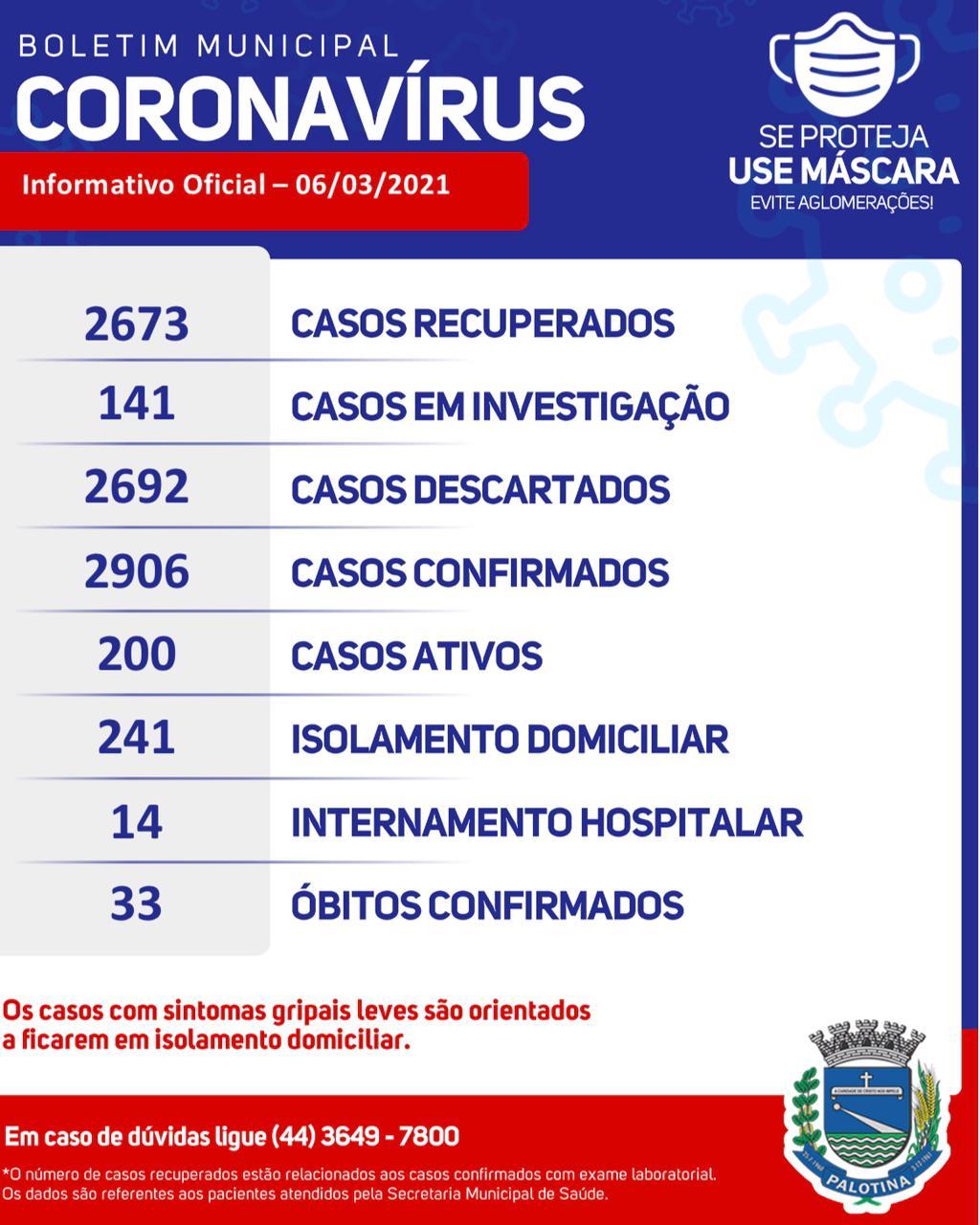 O boletim informativo deste sábado (06), divulgado pela Secretaria Municipal de Saúde de Palotina, aponta que 17 novos casos Covid-19 foram confirmados no município, 14 pacientes se recuperaram nas últimas 24 horas, 14 pessoas estão internadas e o número de casos ativos somam 200.